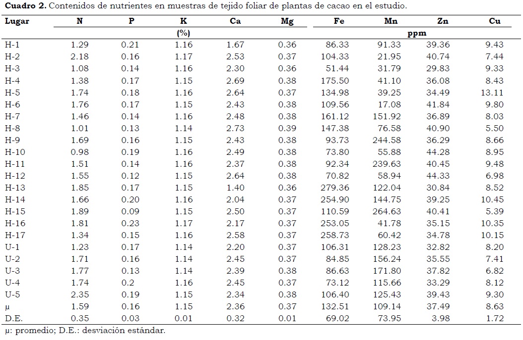 - En el tejido foliar del cacao se observaron deficiencias de N, P, K, Mg y Zn.