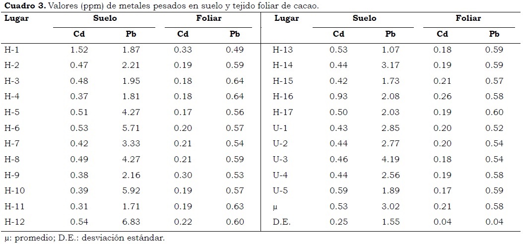 contenidos de cadmio y plomo disponibles en los suelos y en las hojas de cacao